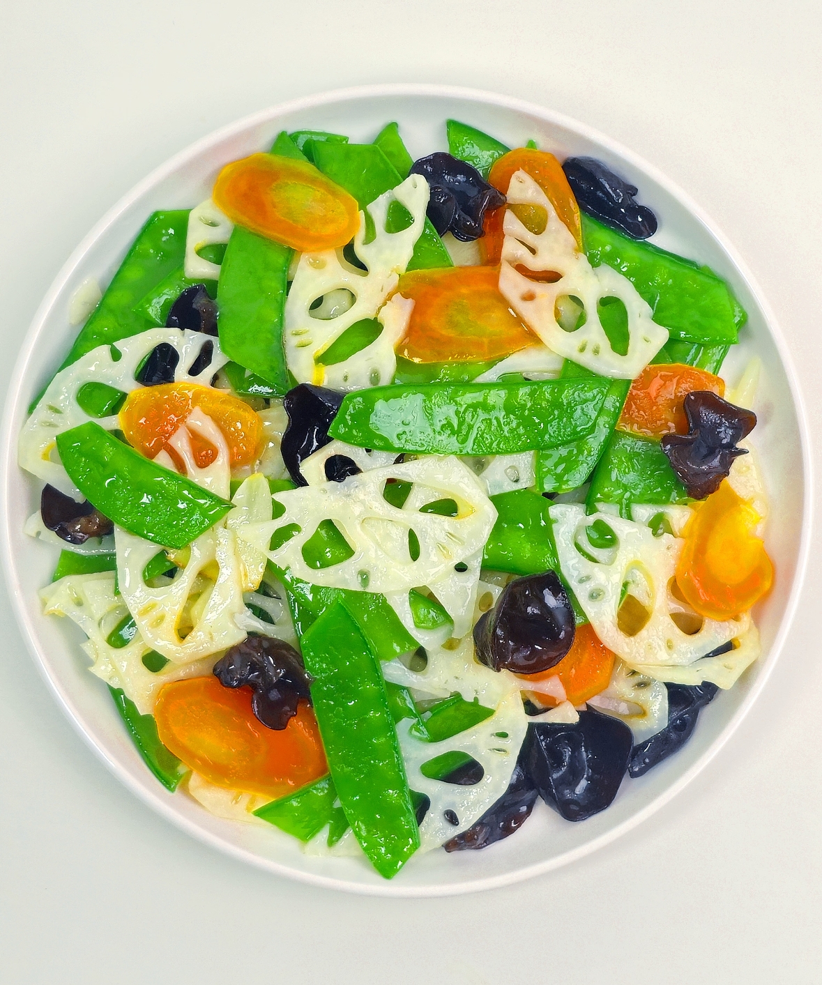 出锅装盘的那一刻,看着盘中红、绿、白、黑相间的色彩,仿佛一幅生动的春日荷塘画卷。夹起一筷子送入口中,莲藕的脆、荷兰豆的甜、木耳的滑、胡萝卜的香在舌尖交织,层次分明却又和谐统一。这道菜不仅美味,更蕴含着丰富的营养价值。莲藕富含膳食纤维和维生素,木耳有清肠胃的功效,荷兰豆和胡萝卜则提供了丰富的维生素和矿物质。一道简单的家常菜,既满足了味蕾,又兼顾了健康。