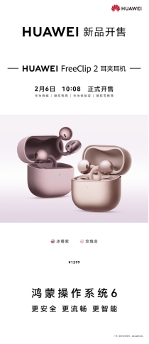 2026年2月6日,华为FreeClip 2 耳夹耳机玫瑰金冰莓紫新色正式开售,售价1299元。