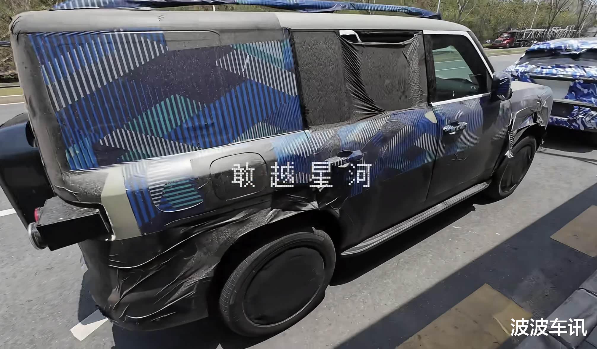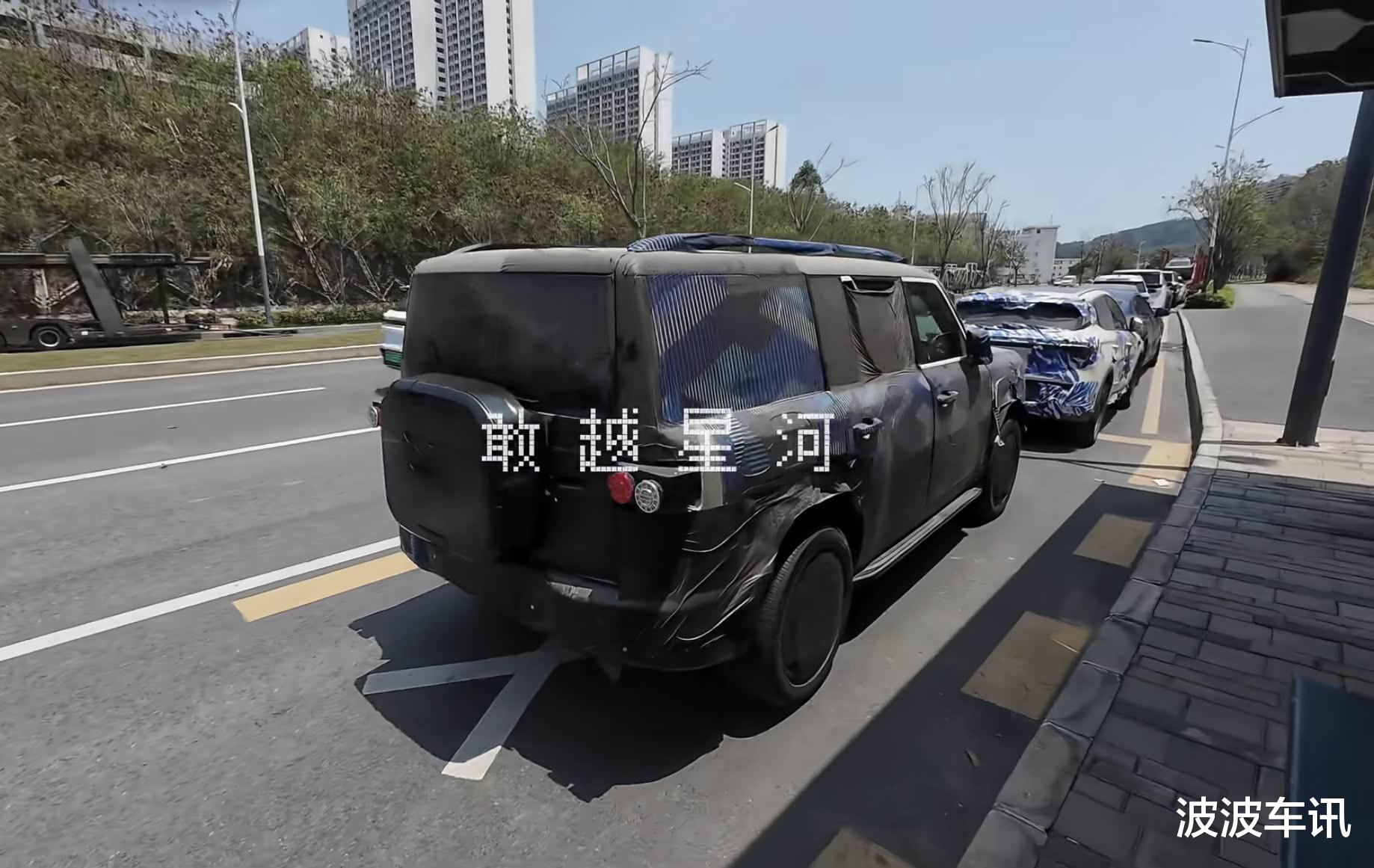 在车尾的部分,我们可以看到新车采用较为垂直化的风格打造,它可能继续采用侧开门的方式,并且尾部还悬挂有一个小背包,车的底部有突出的包围。新车的尾灯采用的是方形的突出的轮廓,整车的外观采用非常硬派化的设计。在动力方面,新车可能搭载的是和豹5一样的1.5T发动机和双电机组合,综合扭矩505千瓦,CLTC纯电续航125km。