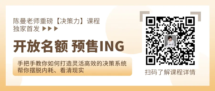 怎样才能获得这种真正强大的内心能量呢?需要你具备系统的决策观。有自己系统决策观的人,是不会被简单的输赢对错带跑偏的。不论现状如何糟糕,永远立足现实,永远抓主要矛盾,这才能让你所经历的伤害成为你的铠甲而不是创伤。系统的决策观如何拥有?如何让自己身段灵活、敢于行动?加入陈曼老师正在热卖的《决策力课》,助你掌握婚姻主动权!这套课程权益包括:1️⃣3节大内容深度讲解(平均每场不低于3小时,没有废话)2️⃣1场深度答疑(答疑时长不低于3小时,全是痛点)3️⃣近10W字课程资料+部分直播逐字稿4️⃣现在下单还能享有【陈曼老师课内1V1邮件互动】特权。课程下个月正式开始,扫描下方二维码详询助理老师吧~
