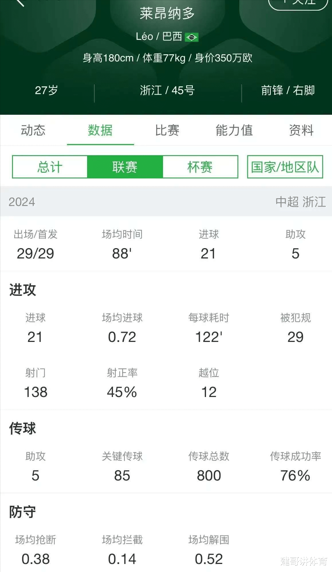 对于莱昂纳多24赛季的个人数据,建哥感觉假如不是莱昂纳多遭遇亚足联的禁赛,他在亚冠赛场上的进球也不会太少,当浙江队新赛季很难继续留住这位泰山队的外援前锋时,考虑到上海申花和山东泰山队之间的球员互动频繁,山东泰山可以把小摩托送到上海申花,也就可以把莱昂纳多也送到上海申花的,对于莱昂纳多新赛季加盟上海申花的概率到底有多大的疑问,从上海申花门将鲍亚雄的社交也可以提前知道答案了,在鲍亚雄已经关注了莱昂纳多后,鲍亚雄的个人社交也疑似提前泄密了莱昂纳多加盟的事情。