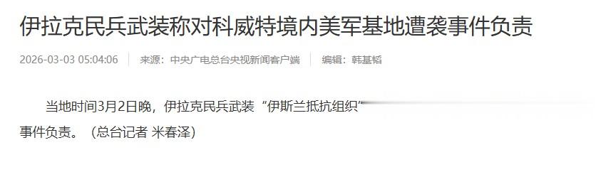 据报道:伊拉克民兵武装,已实锤参战了,不仅攻击、瘫痪——其实就是报废了伊拉克境内的美国军事基地,还杀入了科威特,攻击在科威特的美国军事基地。