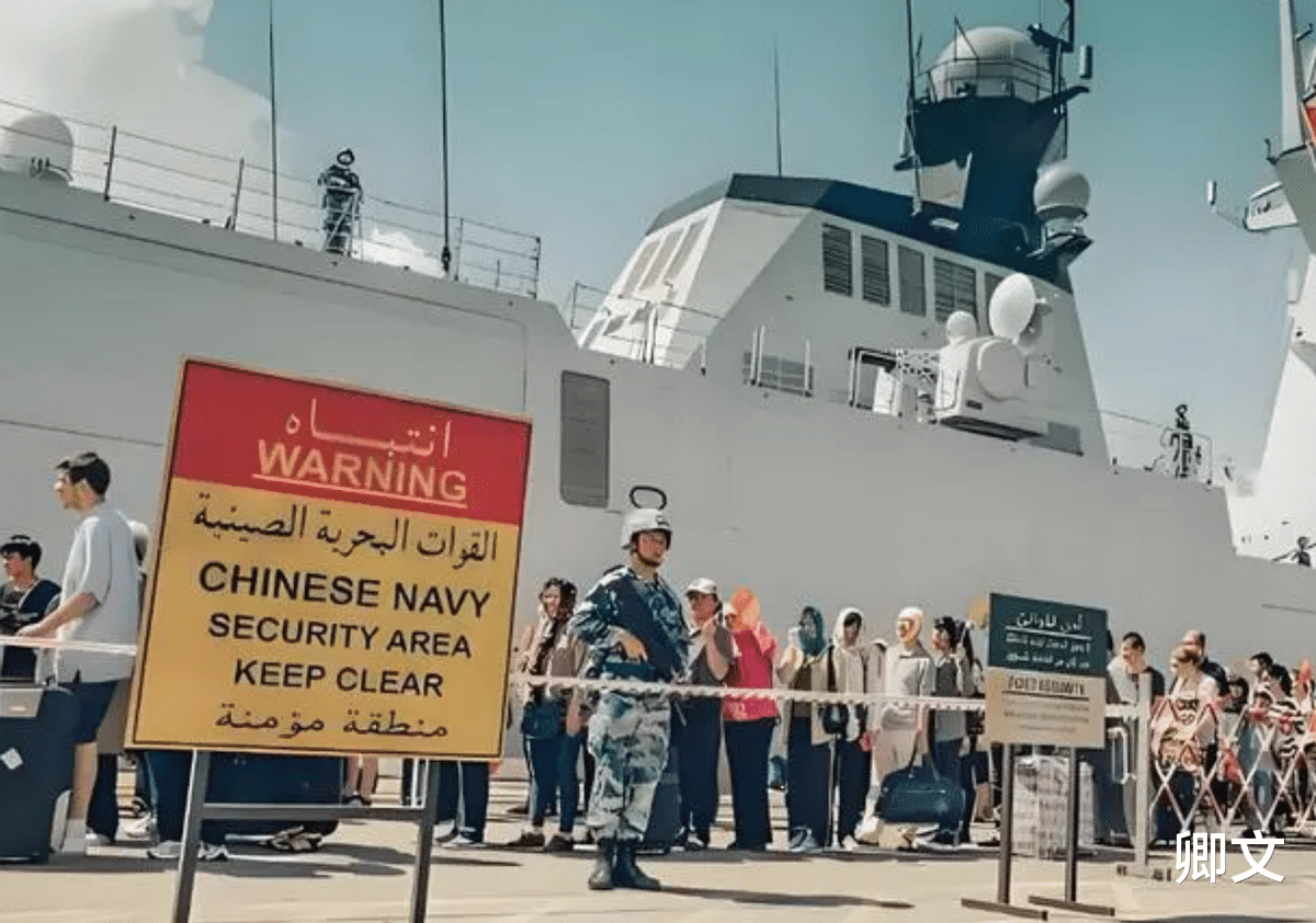 当时利比亚战区内不少武装势力盯上了撤离的船只和飞机,但看到军舰和那一块标牌的瞬间,他们迅速散开,不敢靠近。