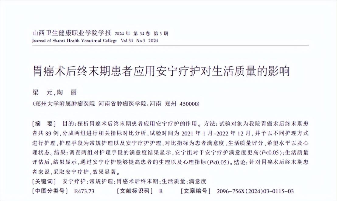 参考文献[1]梁 元,陶 丽.胃癌术后终末期患者应用安宁疗护对生活质量的影响,山西卫生健康职业学院学报,2024