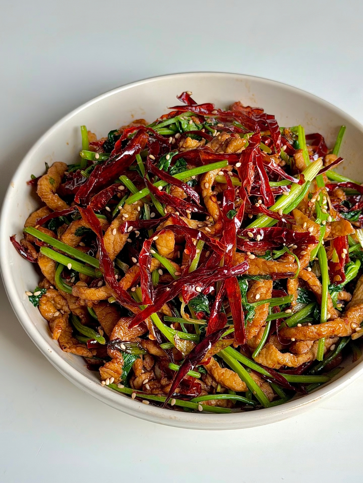 接着,是见证奇迹的时刻。将之前炒好的肉丝重新倒入锅中,与红辣椒丝一同翻炒均匀。此时,可以根据个人口味加入适量的生抽、少许老抽调色、一点白糖提鲜,快速翻炒,让酱汁均匀地包裹住每一根肉丝和辣椒。最后,撒入准备好的香菜段,只需翻炒几下,待香菜的香气刚刚释放出来,即可关火出锅。