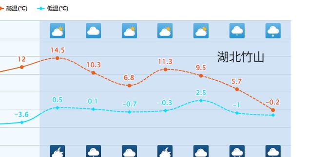 比如:湖北竹山,在回暖之后,气温最高将会达到14度左右,而过后,整体趋势一路下滑,在20日会反弹一下,也只有11度左右。