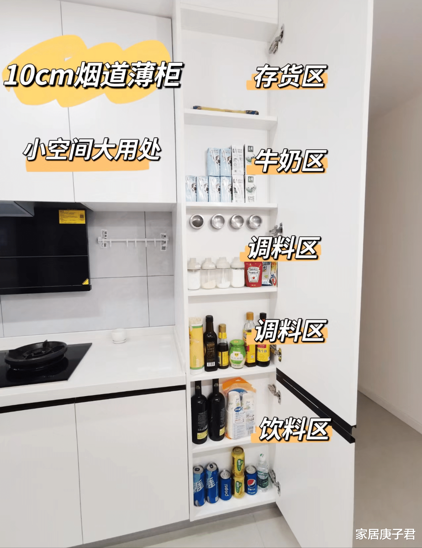 4.烟道薄柜--拉平橱柜的缺口厨房的烟道是一个让人头疼的存在,不仅占据了宝贵的空间,还因为其特殊的尺寸,无法与橱柜完美融合,显得格外突兀。在寸土寸金的厨房里,每一寸空间都显得异常珍贵,而烟道的存在无疑让空间利用变得更加困难。