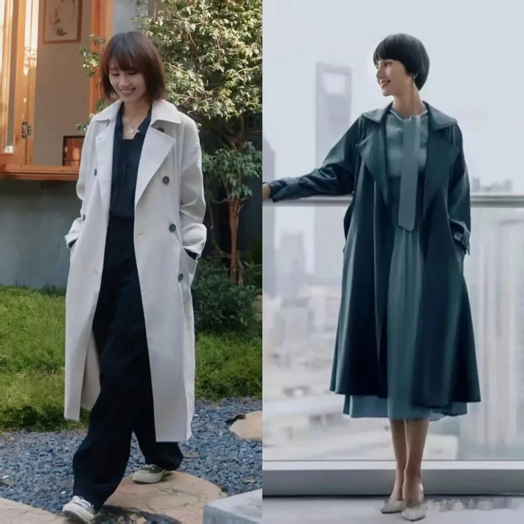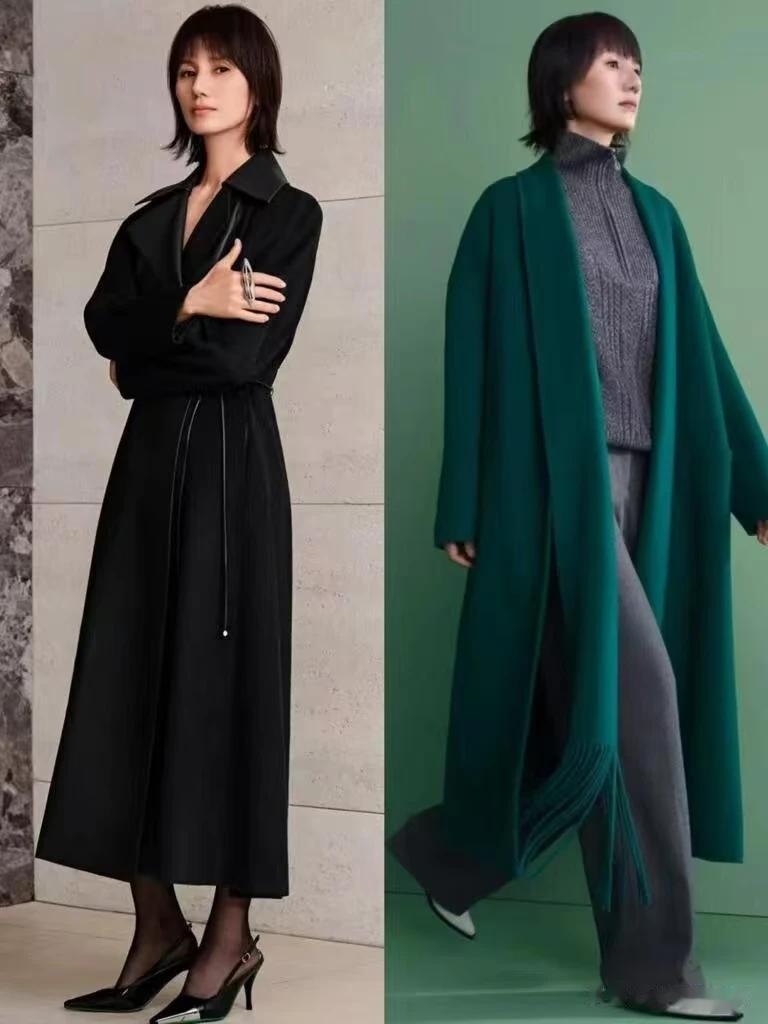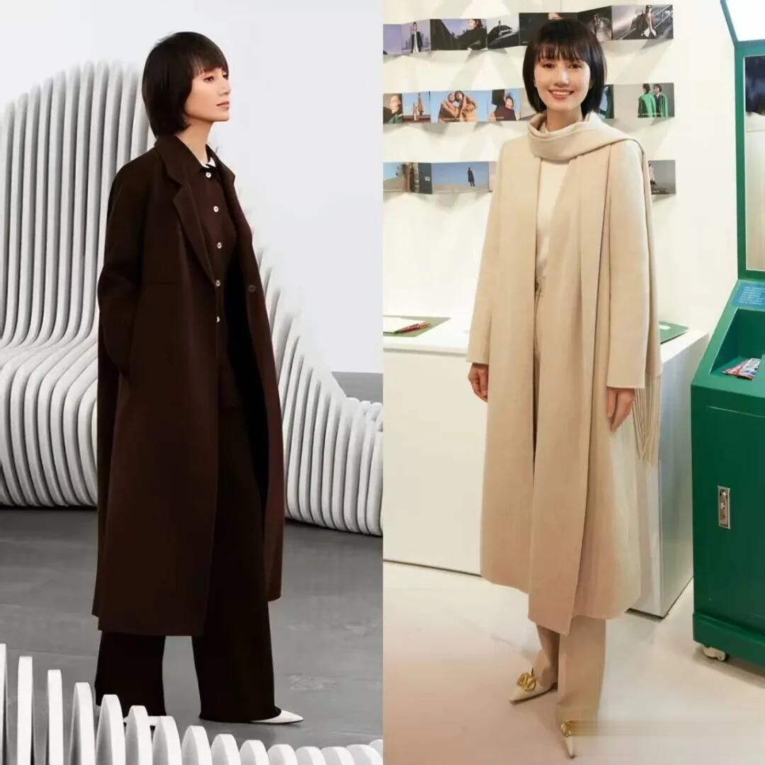 大翻领的优势在于其“视觉延伸感”。立领容易显得脖子短粗,而大翻领则通过领口的宽度和长度,既拉长颈部线条,又通过领口的垂坠感增加整体造型的层次感。比如袁泉常穿的藏青色大翻领大衣,领口的宽度既能修饰脸型,又通过领口的垂坠感与大衣的剪裁形成对比,既增加了视觉丰富度,又通过领口的弧度传递出温柔的气质。