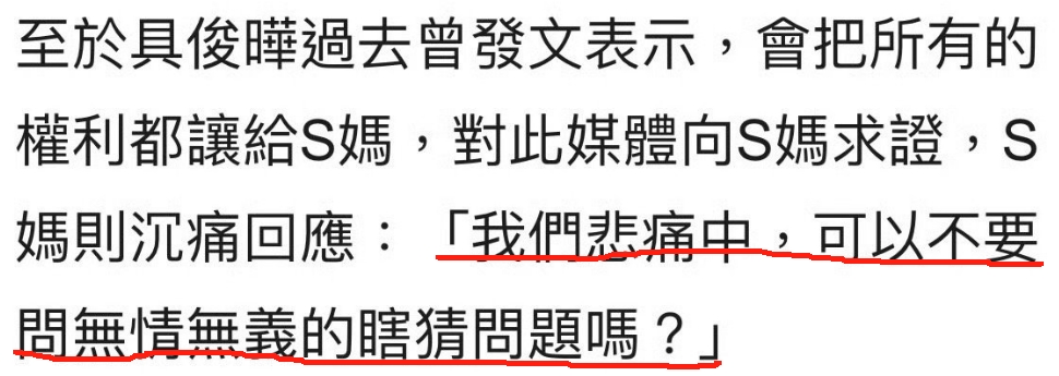 当时S妈含糊其辞,称“我们悲痛中,可以不要问无情无义的瞎猜问题吗?”