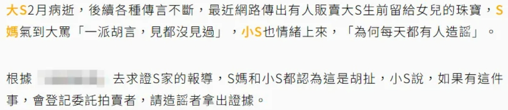 除了否认拍卖女儿的珠宝,S妈还提到了另外一件事,那就是大S的遗产分配事宜。