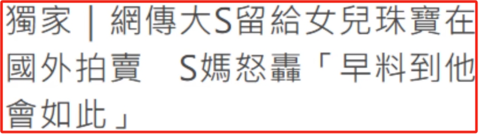 事情的起因,是网传大S留给小玥儿的珍贵珠宝,疑似出现在了国外某拍卖会上,于是S妈、具俊晔和小S都成了被怀疑的对象。