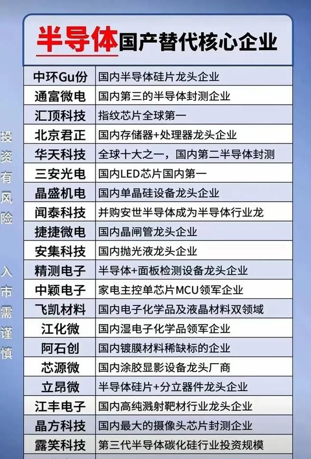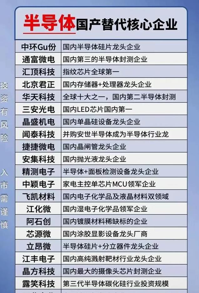 代表企业有立昂微,该公司是国内颇具竞争力的半导体材料、功率半导体和集成电路制造的产业平台,其主营业务是半导体硅片、半导体功率器件芯片、化合物半导体射频芯片。