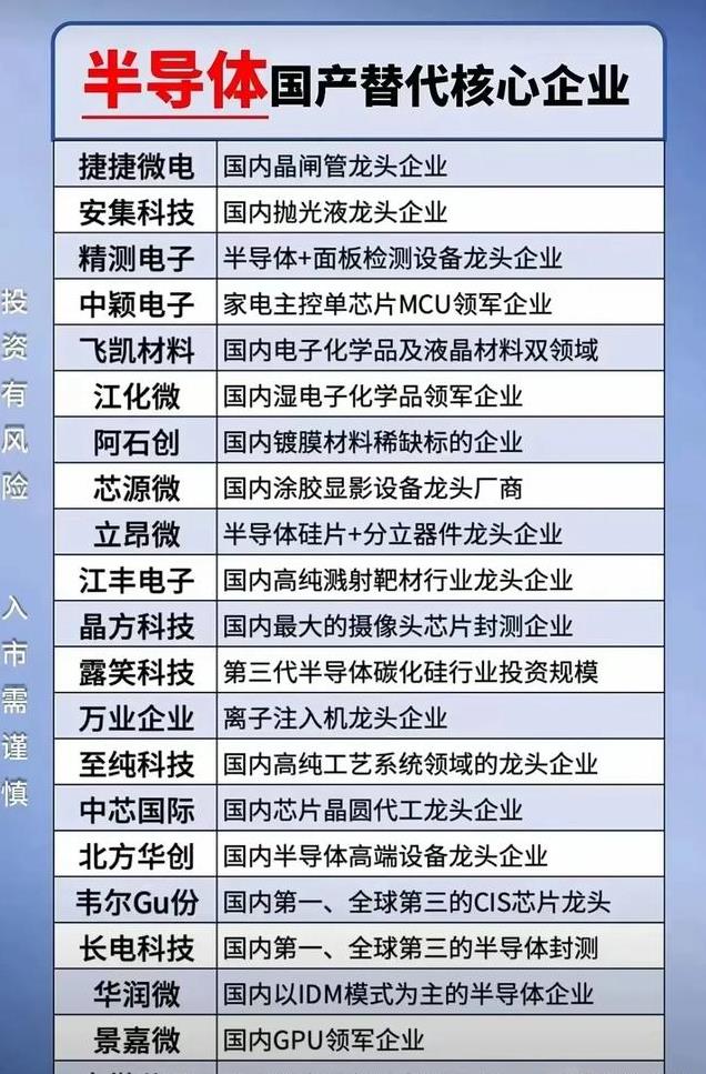 代表企业有安集科技,该公司的产品化学机械抛光液和光刻胶去除剂为关键半导体材料,已打破国外垄断,其主营业务是关键半导体材料的研发和产业化。