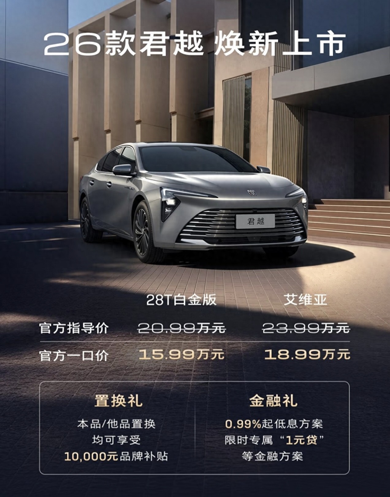15.99万的2026款君越两驱白金版,核心卖点就四个字——大、稳、体面。