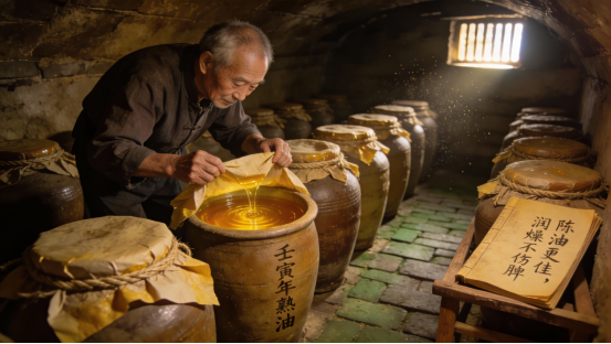 这种跨越不仅是生化意义上的,更是文化意义上的。中国人之所以相信“老油更佳”,之所以愿意把油存放于阴凉处,放至来年甚至更久使用,是因为他们对油的理解不是现代包装上的清亮,而是身体和味觉对稳定性的长期记忆。老油之所以珍贵,从来不是因为年份,而是因为结构成熟的深度。