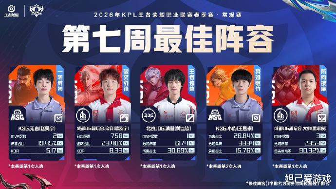就在今天,KPL官方公布了常规赛第七周的最佳榜单,来自KSG、AG、JDG三支队伍的五名选手瓜分榜单,其中AG游走位选手