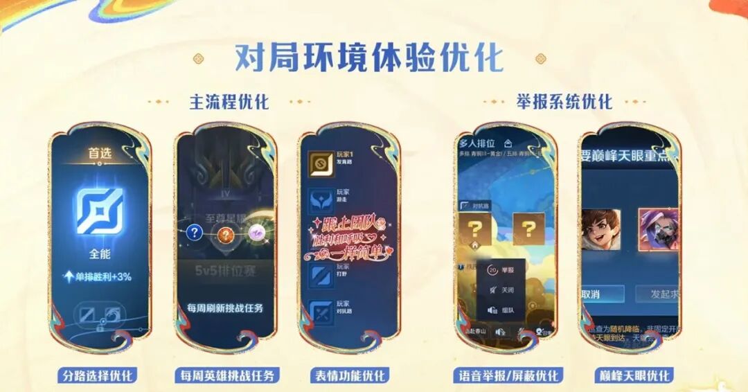 新赛季的对局环境也会得到优化,特别是举报这一块。春节这几天,几乎每一局败方MVP,都能举报成功1-2人。这对局环境还是有待提升。