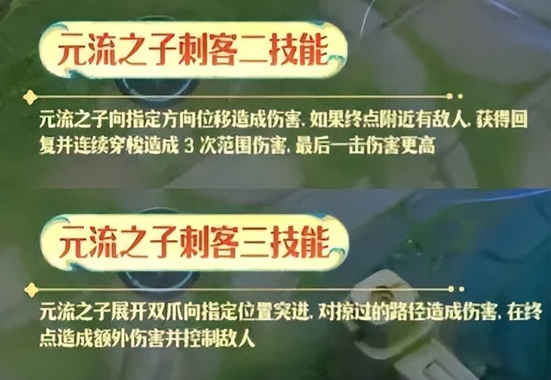 元流刺客的技能,基本就是位移和伤害的组合。大招效果有点像兰陵王,但是它带控制效果。