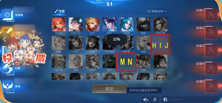 最后是直播中看到的中路为有两个屏蔽英雄,意味着有两位中路英雄还没有上线。从英雄排序来看,是拼音首字母按英文26个字母排序的。那么第一个夹在海诺的H和姜子牙的J中间,基本就是H、I、J开头的英雄,因为I几乎没有,所以英雄名字是H或者J开头的。第二个是在墨子的M和女娲的N中间,所以可能是M或者N。之前曾预告过的英雄还有六耳和王维没有上线,从首字母来看,这两个均不是法师英雄。