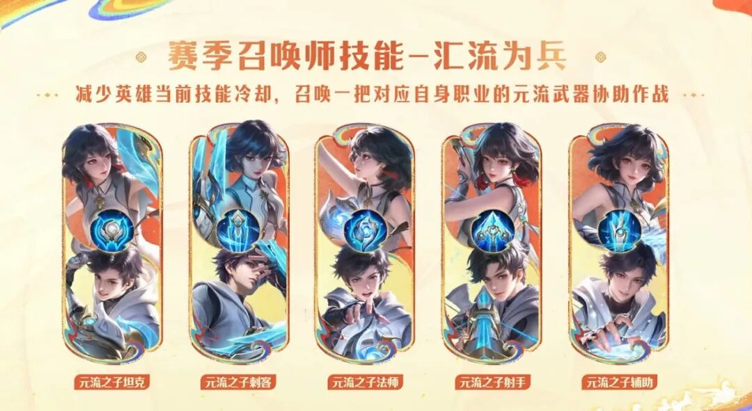 S43赛季,所有分路的元流之子都会增加一个召唤师技能,名为“汇流为兵”。可以减少英雄当前的技能冷却,并召唤一把对应自身的武器协助作战。