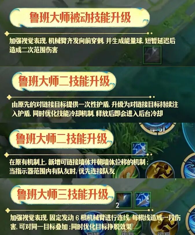 鲁班大师这是把被动直接改掉了。二技能改为持续护盾和新增可以链接墙体位移。大招固定为六根机械臂,之前是最多链接6个敌人,而现在如果人数不足,可以对同一目标叠加。