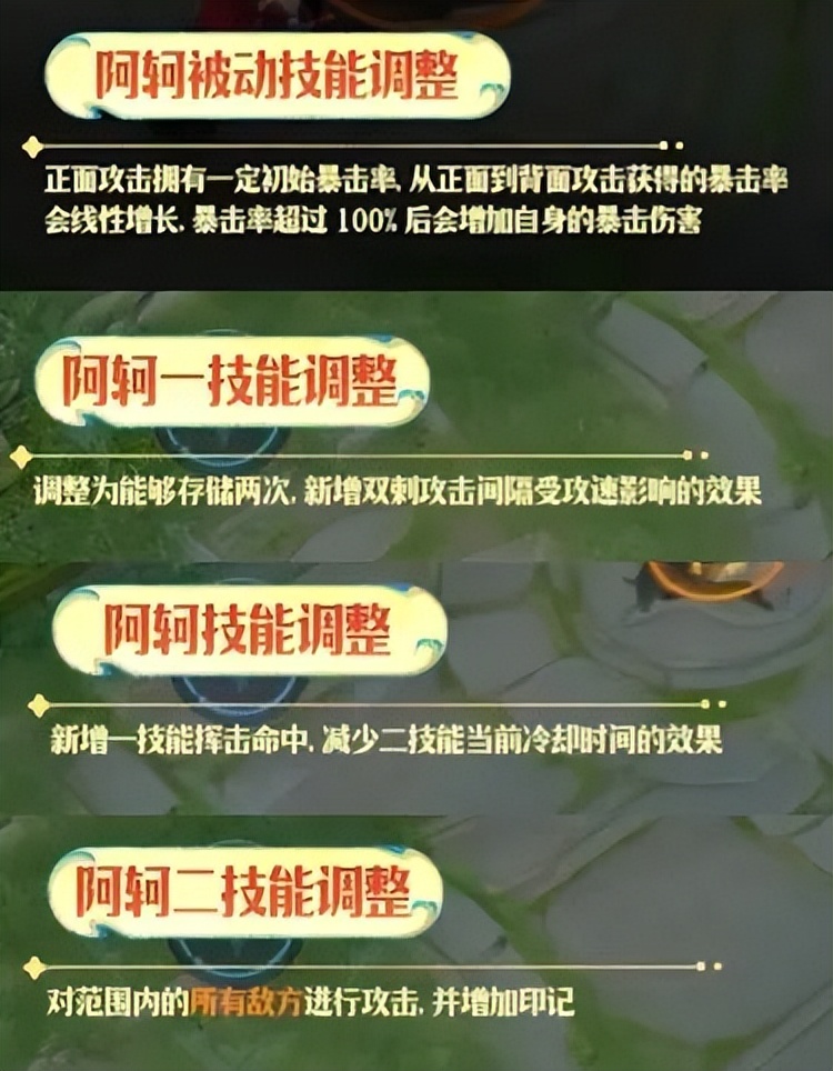 阿轲被动调整,改成正面攻击也有一定暴击率,还会成长,超过100%暴击率后变成增加暴击伤害。一技能改成储存两次,命中后可以减少二技能的冷却,且二技能改为对所有敌方进行攻击和标记。有点像最初版本的阿轲了。