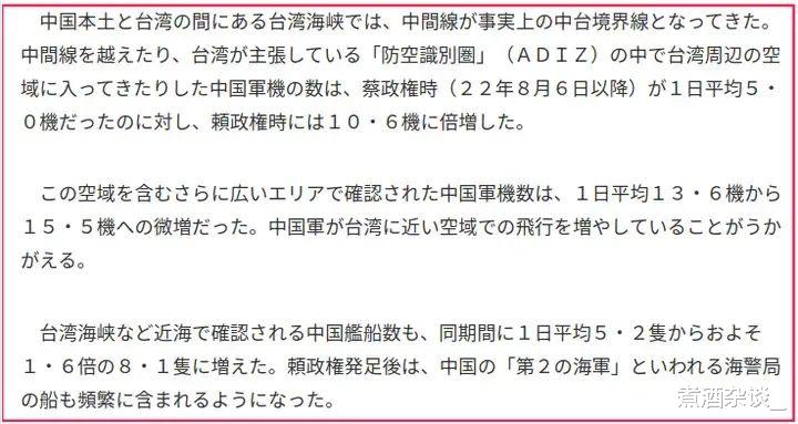 2月12日的日本《读卖新闻》报道说:在台湾周边空域的解放军军机数量,从蔡政府时期(2022年8月6日以后)平均每天5.0架,已上升至赖时期10.6架,一下子翻了一倍。在周边更大区域内,解放军军机数量从平均每天13.6架增至15.5架。台湾海峡等近海海域发现的解放军舰船数量也从平均每天5.2艘增至8.1艘。“第二海军”的海警船也更频繁进入。