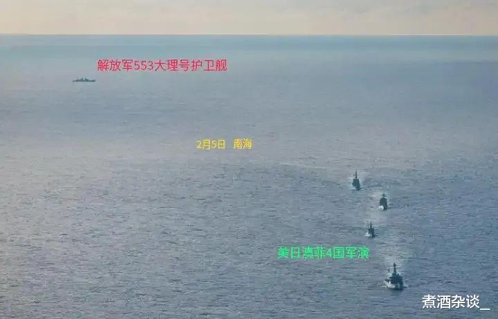 解放军派舰机、电子侦察船就近监视美军及相关演习,已是国际惯例。例如美日澳菲2月初在南海的演习(下图),解放军就派出护卫舰553大理舰就近观摩。