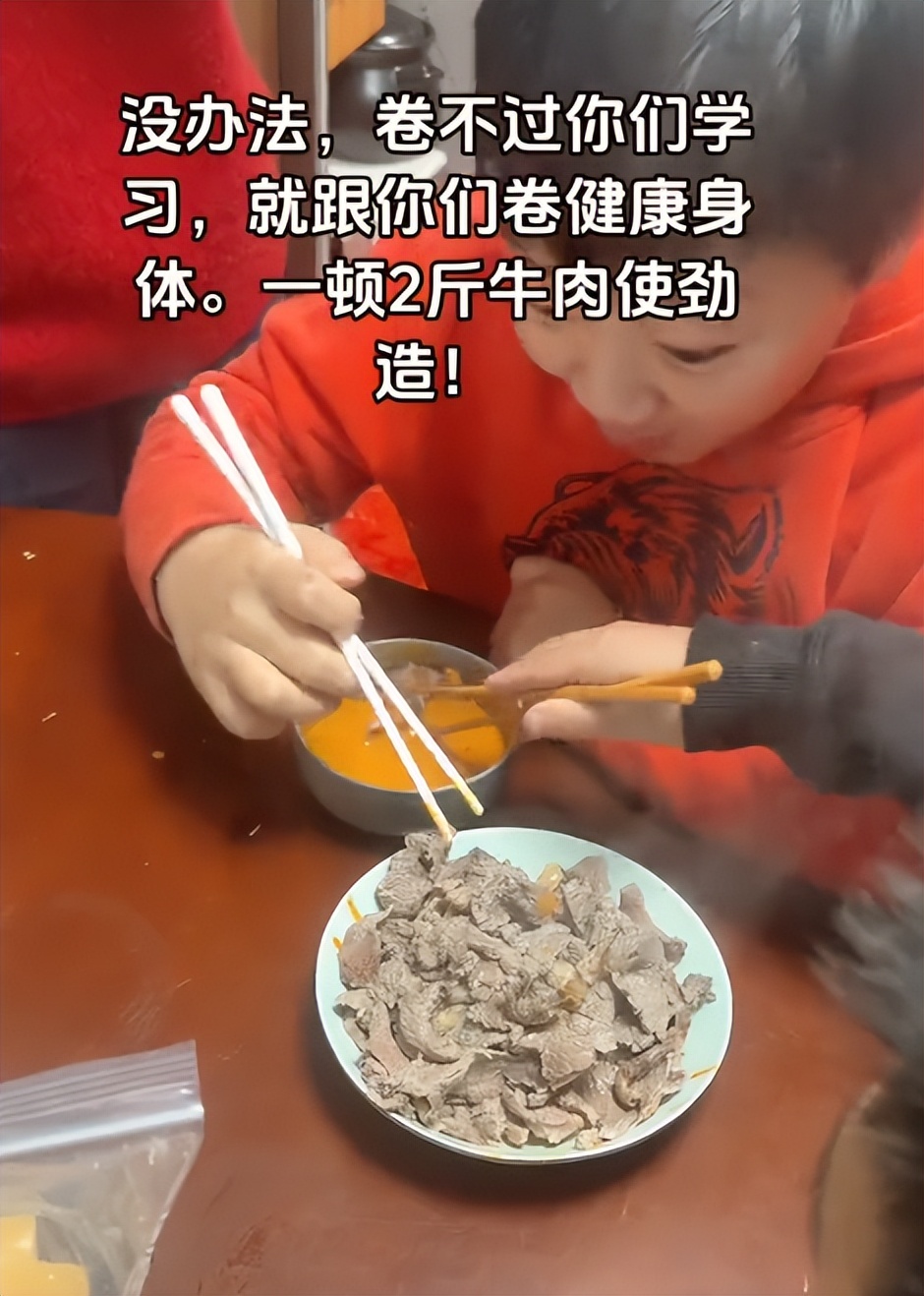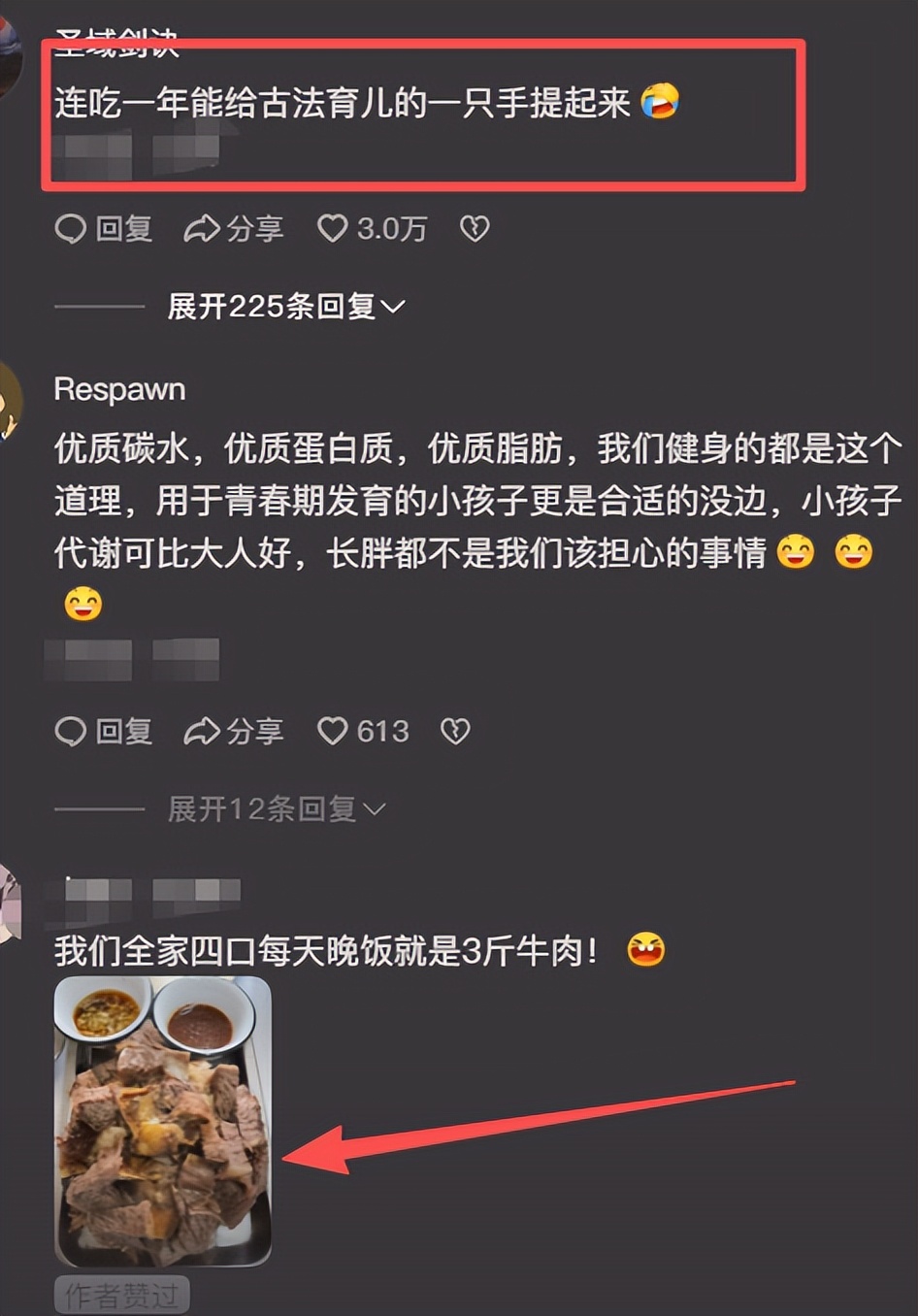 大家开玩笑说,真的能把那些古法育儿出来的小弱鸡们当杠铃一样抬起来用。另一位青海的家长同样也是看开了的一位,全家四口每天晚饭就是三斤牛肉。