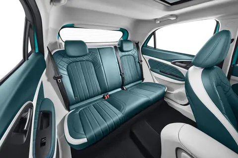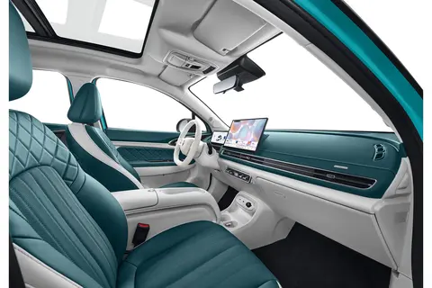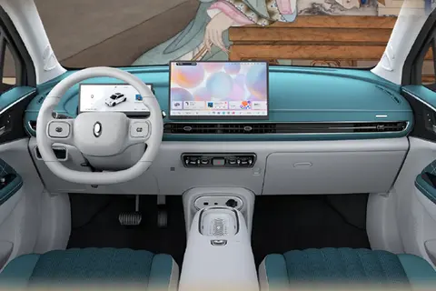 车身配色也很有特色,六款颜色灵感都来自Vintage珠宝,点翠蓝、璀璨绿、粉珊瑚这些颜色质感拉满,尤其是在阳光下,车漆光泽度特别好。后来才知道,这款车采用了8层车漆工艺,喷涂环境几乎“零灰尘”,而且油漆色彩粒子外面包着树脂,能抵御轻微剐蹭还能自我修复。