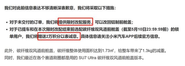 小米官方在5月7日已经针对此事公开致歉,称此前信息表达不够清晰,对未交付的订单提供限时改配服务,为已提车和锁单用户赠送2万积分,但这样的回应并未得到车主的认可,车主喊话雷军“保持真诚”,只有直面质疑才能挽回口碑。