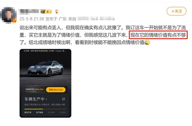 有博主很早就已经订购小米SU7 Ultra,该博主坦言买这款车就是为了情绪价值,在经过漫长的等待后,如今只需要再等6-9周就能喜提新车,但经过这几波事件后博主认为这款车能提供的情绪价值有些不太够了,提车或许也早已没有了当初的那股兴奋劲。