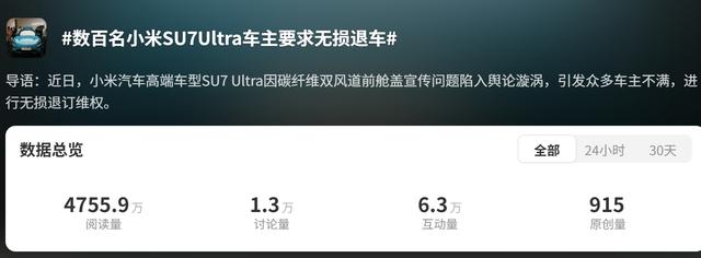 小米SU7的出现让很多人惊呼原来汽车市场还能如此热闹,然而当流量大到一定程度时,车辆稍微有点负面新闻就很容易遭到流量的反噬。不久前,有用户在拆解小米SU7 Ultra后发现挖孔前机盖疑似“货不对板”,质疑小米汽车“虚假宣传”。随后国内多地小米SU7 Ultra车主自发组建维权群,目前已经有近400名车主集体要求无损退车,还有车主已委托律师准备起诉小米,要求“退一赔三”。