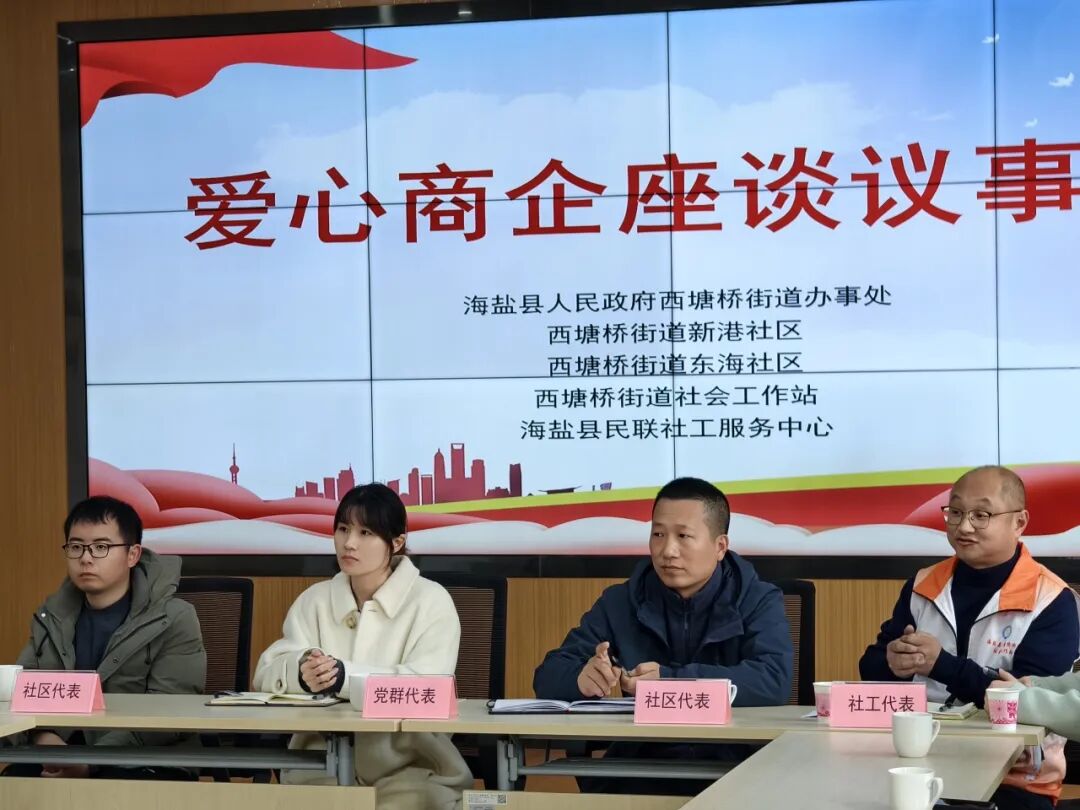 为深化党建引领基层治理,凝聚辖区商企爱心力量,搭建公益联动与资源互通桥梁,构建“商企联盟”共建共治共享新格局。2026年1月28日下午,在海盐县人民政府西塘桥街道办事处的支持与指导下,西塘桥街道社会工作站、海盐民联社工携手街道党群服务中心、新港社区、东海社区召开“爱心商企座谈议事会”。医疗、金融、餐饮、物业等多领域商企代表齐聚一堂,共话协作发展,参与20余人。