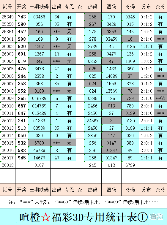 26018期:暄橙福彩3D综合条件(本期将在1月18日21:15开)一、上期回顾 ☆1、上期开奖号:9 4 5。2、和值= 18,跨度= 5。3、常态组六,012路组合。4、热度分布(热:温:冷)1:1:1。二、本期条件 ☆1、三期缺码:0167。2、热:245,温:013,冷:6789。3、断组分解式:3489//012-567。4、四胆:4678;三胆:478。三、术语解释 ☆1、三期缺码:0至9这十个自然数当中,未在近三期开奖号出现的数字。2、热度(热温冷):自然数0至9,在近七期开奖号中,出现3次及3次以上的数字,称为热码;出现2次的数字,称为温码;出现1次和未出现的数字,称为冷码。某个数字在开奖号中出现几个,就按几次计算。3、断组分解式:将0至9这十个自然数,分成三组数字,从前往后依次为A组(4码)、B组(3码)、C组(3码),一般情况下,有一组数字不出码,偶尔会有两组数字不出码。A组不出码的情况相对较少。断组为主,分解为辅。4、常态组六号码:同时包含大数、小数、奇数、偶数、质数、合数的组六号码,共有72注。统计表中,简称“常态”。5、非常态组六号码:全大数、全小数、全奇数、全偶数、全质数、全合数等六种形态的组六号码,共有48注。统计表中,简称“非常”。★提醒:彩市有风险,参与须谨慎!水平有限,仅供参考!