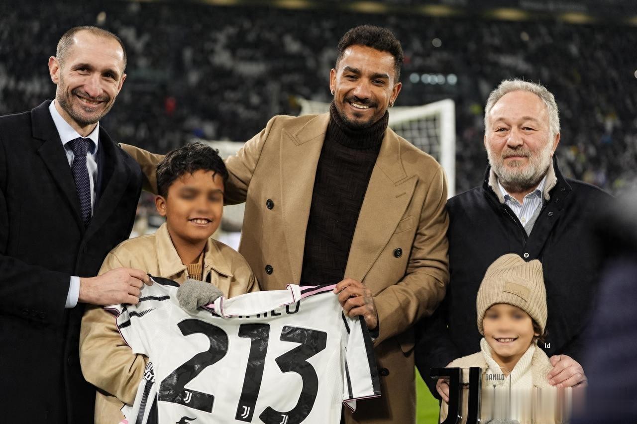 赛前,前尤文球星达尼洛亲临现场,和尤文名宿基耶利尼合影留念,赢得尤文球迷阵阵掌声。