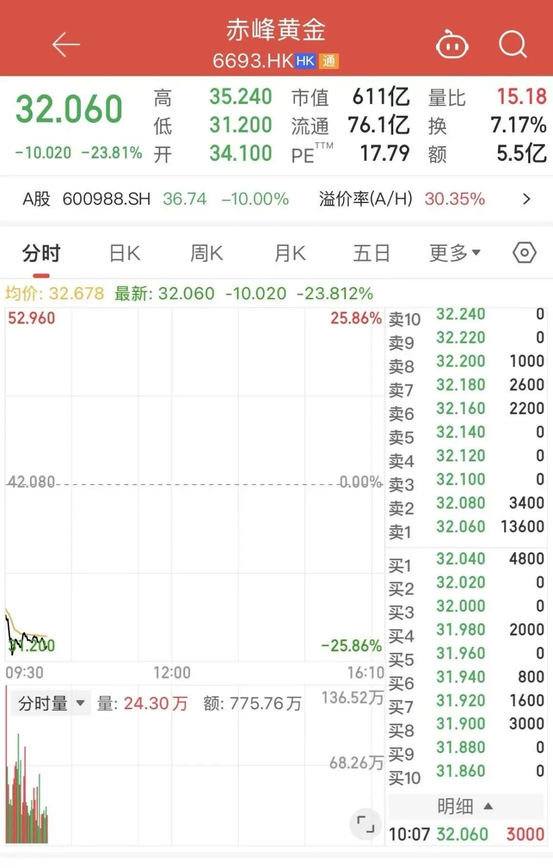 百亿利好加持,市场却迎当头一棒。3 月 23 日早盘,赤峰黄金复牌直接一字跌停,封单超 7 亿元,港股同步大跌超 24%;整个贵金属板块集体下挫,山东黄金、中金黄金等全线走低,寒意蔓延全场。