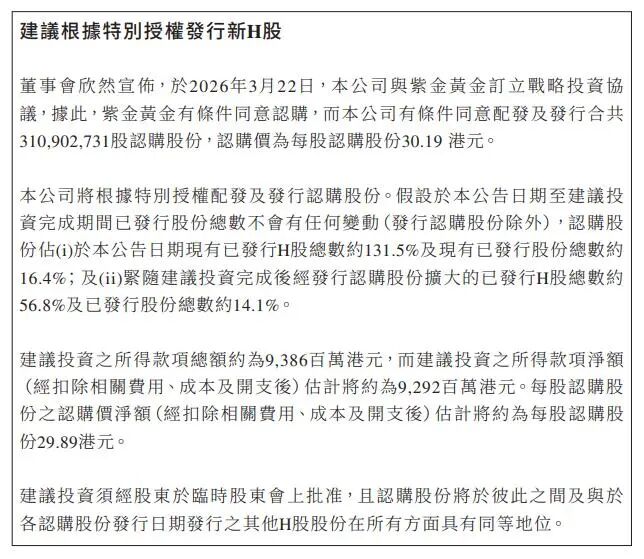 同步落地的还有大额战略定增,紫金黄金以 30.19 港元 / 股,认购赤峰黄金 3.11 亿股 H 股,认购净额约 92.92 亿港元,资金将全部用于矿山运营、产能升级及长远资源布局。