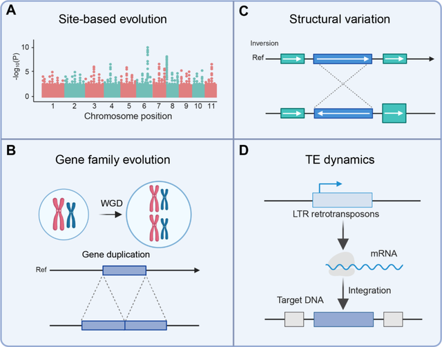图2. 用于研究高山植物适应性的4种主要遗传变异类型:位点层面的SNP/正选择信号(A)、WGD 与基因家族演化(B)、结构变异(C)以及转座子插入及其潜在调控效应(D)。