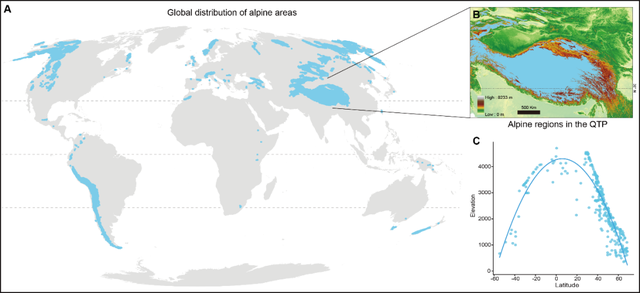 图1. 全球高山区域的范围与分布:30 m 分辨率的全球高山分布图(A)、青藏高原高山区域示意(B),以及全球高山区域的林线海拔与纬度关系(C)。