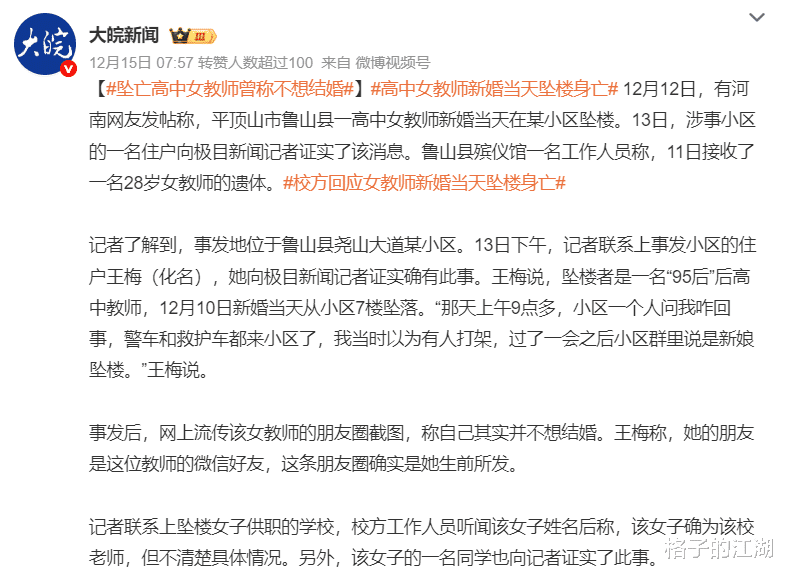 结婚当天,年仅28岁的高中女教师魏某,从7楼婚房里一跃而下。