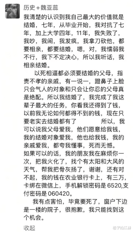 与此同时,她的朋友圈遗言在当地疯传,后来又在互联网上掀起惊涛骇浪,里面以自嘲口吻写着她对父母催婚的不满和抗争,称“自己最大的价值就是结婚”。
