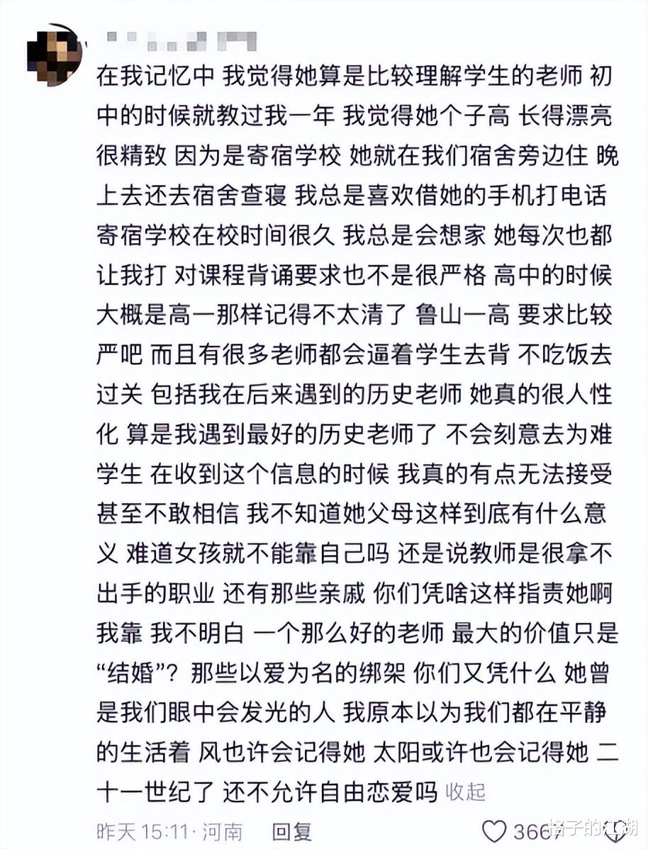 以至于学生们根本想象不到,课堂上那般明媚爱好的魏老师,竟然已经处在催婚逼婚的心理压力下多年,以至于学生们听闻她的死讯时,只觉得是恶作剧,直至看到她的朋友圈遗言。