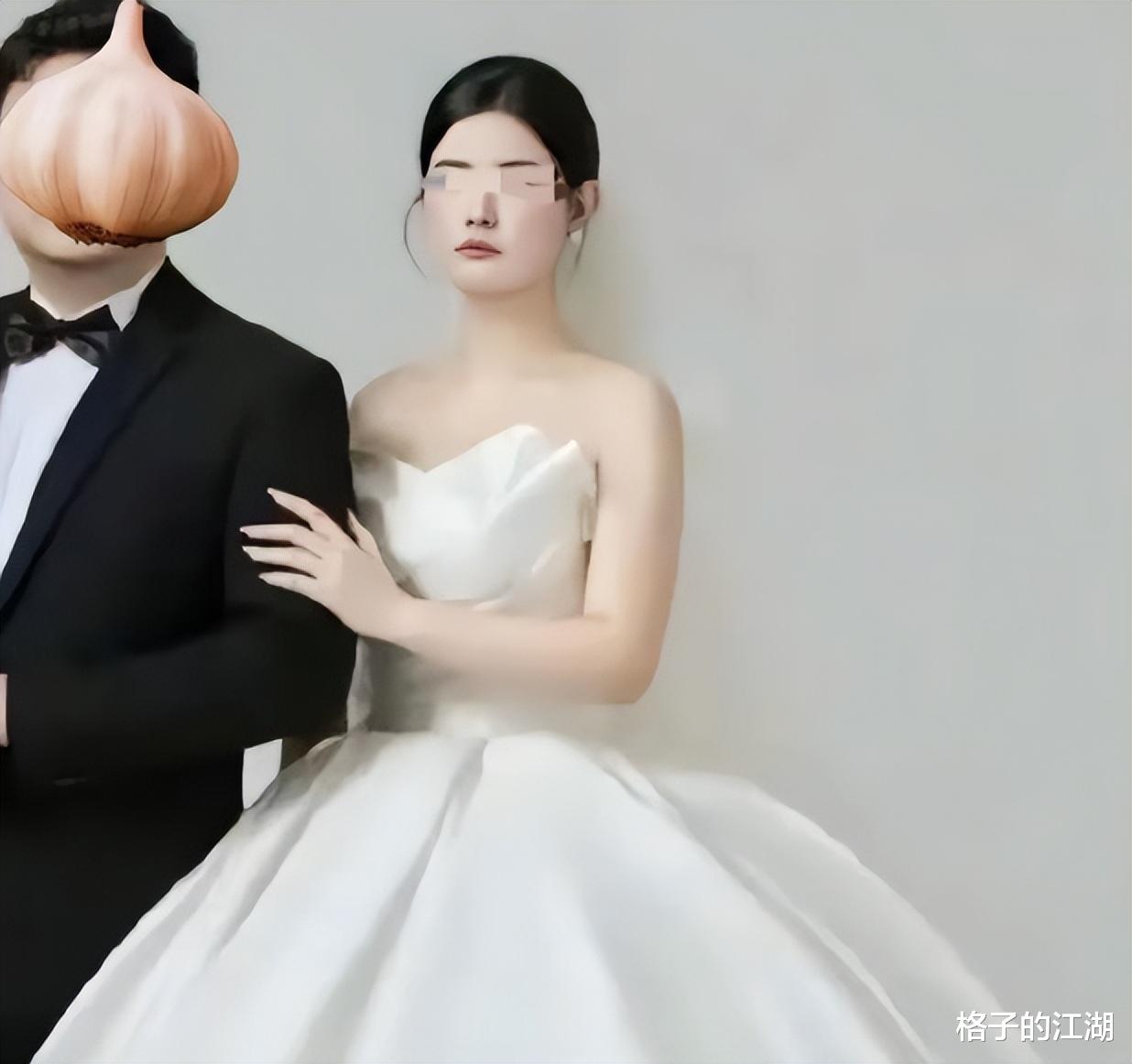 照片里,本该笑意盈盈的她,脸上依然没有任何笑意,只是机械般单手扶着结婚对象,嘴角向下,而不是上扬,身体距离疏离,完全不如生活照里那般明媚开心喜悦。