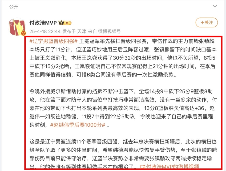 辽宁队此役展现了战术的灵活性,张镇麟的出场时间阵容其他球员巧妙填补。尤其是王岚嵚,他获得30分32秒的出场时间,8投5中砍下15分2抢断,用行动证明了自己的价值。知名媒体人付政浩第一时间发文称赞:“王岚嵚不仅常规赛配得上21分钟的出场时间,在季后赛他同样值得信赖。”外援威尔斯则凭借付豪的挡拆频频冲击篮下,14投9中拿下25分9篮板8助攻,他的单打效率让对手防线无可奈何。赵继伟延续稳健表现,11投7中贡献22分5助攻,还迎来了个人季后赛里程碑。球队通过横扫争取了更多休息时间,韩德君的手臂伤势有望恢复,但张镇麟的伤病却成了绕不开的话题,辽宁男篮的锋线储备问题被摆上台面,若张镇麟无法满血归来,半决赛的对抗也将是对球队阵容厚度的极大考验。(信息来源:@付政浩)