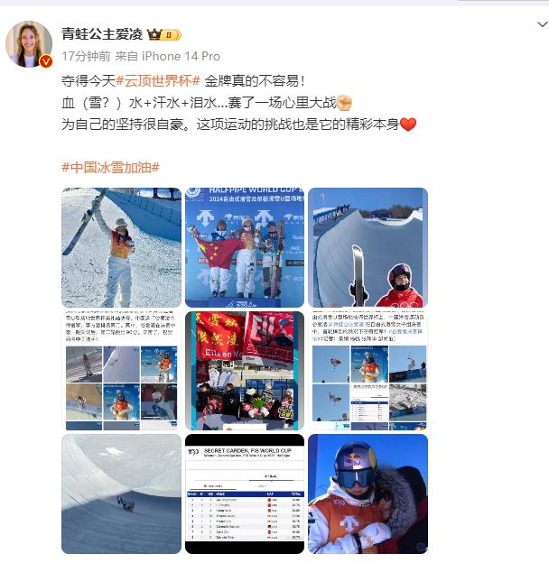 随后谷爱凌发文回应夺冠: 夺得今天云顶世界杯金牌真的不容易!血(雪?)水+汗水+泪水…赛了一场心理大战,为自己的坚持很自豪。这项运动的挑战也是它的精彩本身。