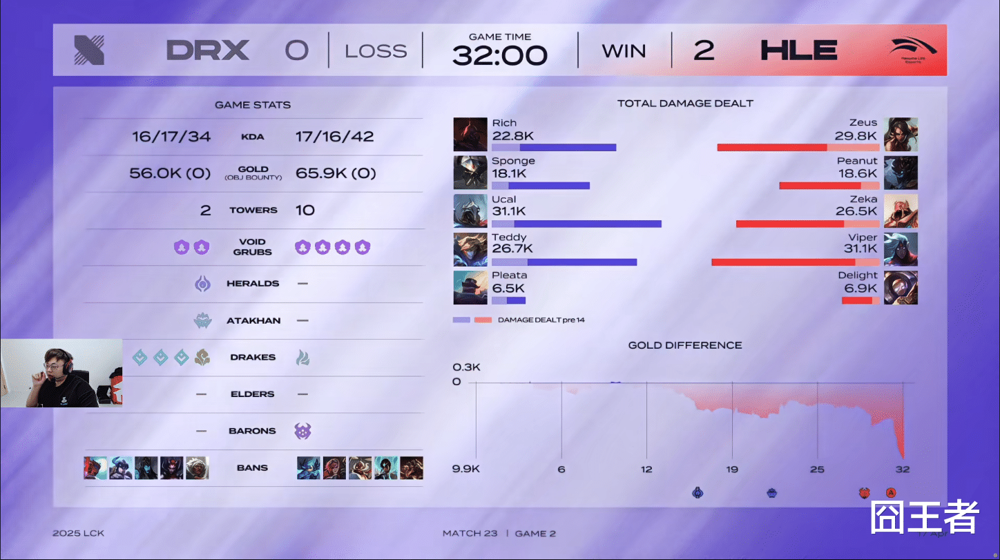 第二局比赛,依旧被HLE打成了是单方面的碾压局。3分钟左右:Sponge蝎子率先出击,Peanut大树成功反蹲,双方打出1换1;10分钟左右:Teddy穿梭E躲韦鲁斯大,配合布隆线杀Viper韦鲁斯;13分钟左右:Zeka沙皇推2人,Sponge蝎子反手拉2人,双方打成1换1;15分钟左右:DRX尝试越塔,Zeka沙皇支援化解,Zeus丝血逃生;19分钟左右:Zeka被开反推三人,维克托极限刷盾死里逃生;29分钟左右:HLE拿下大龙,Zeus豹女单带牵制两人被击杀;最终32分整:Zeka沙皇绕后神推,HLE一波结束比赛。