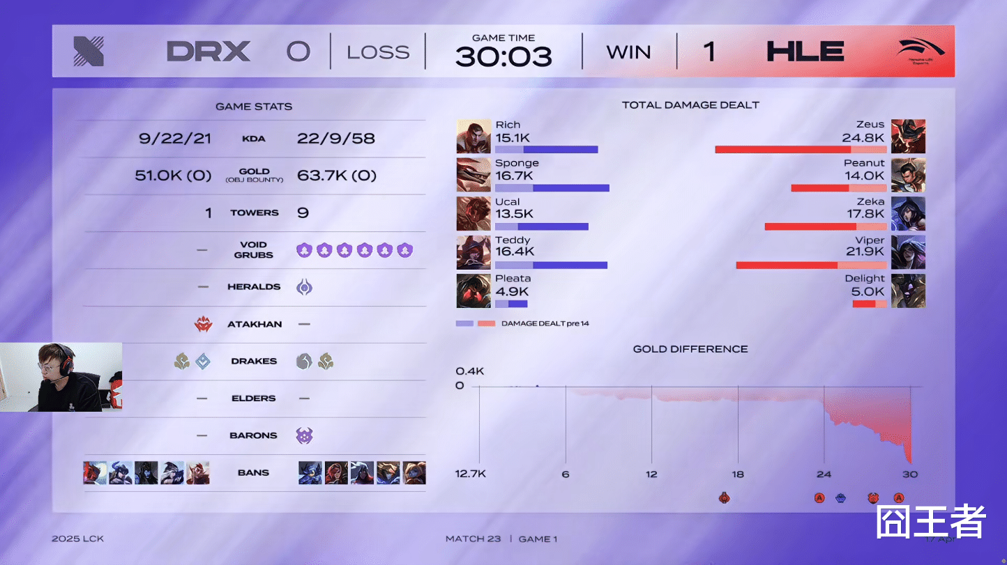 结果第一局比赛,很快的就被HLE打成了单方面的碾压局。3分钟左右:纳亚菲利抓下,泰坦先手钩中,Peanut赵信随后赶到,双方打成1换1;7分钟左右:Teddy关键倒钩拉中3人,随后被Viper卡莎收掉,HLE打出2换3;9分钟左右:Sponge纳亚菲利抢龙成功,但被赵信狐狸联手击杀;16分钟左右:Zeka狐狸先手E中纳亚菲利,Viper进场被集火秒掉;23分钟左右:Ucal闪现撞墙,Zeka关键魅惑收掉霞;最终30分03秒:Zeus兰博闪现狂烤,配合队友跟上团灭DRX一波结束比赛
