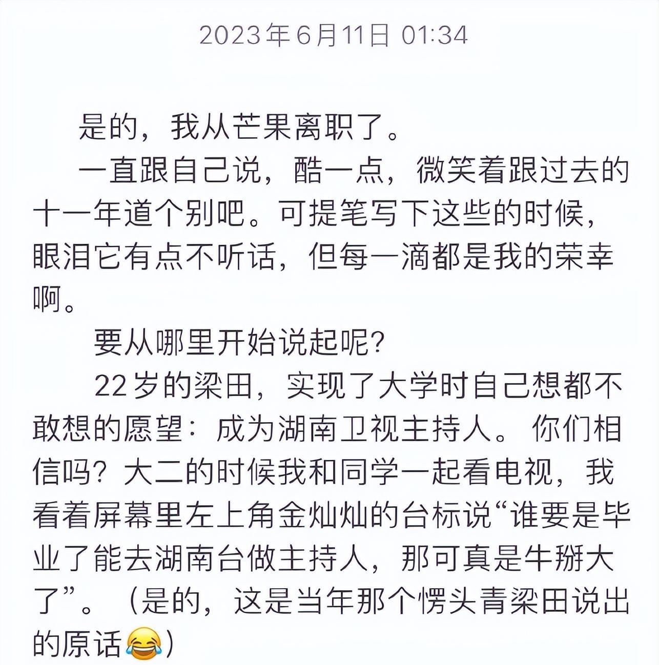 另外,梁田还透露,接下来的11年她想活成大家喜爱的梁田姐姐,无关地位,无关荣耀,只为探寻,同时她也明确告知她离开芒果后不会消失,只不过是换个身份继续陪伴彼此,也考虑往话剧和影视剧方向发展,成为全能型的艺人。