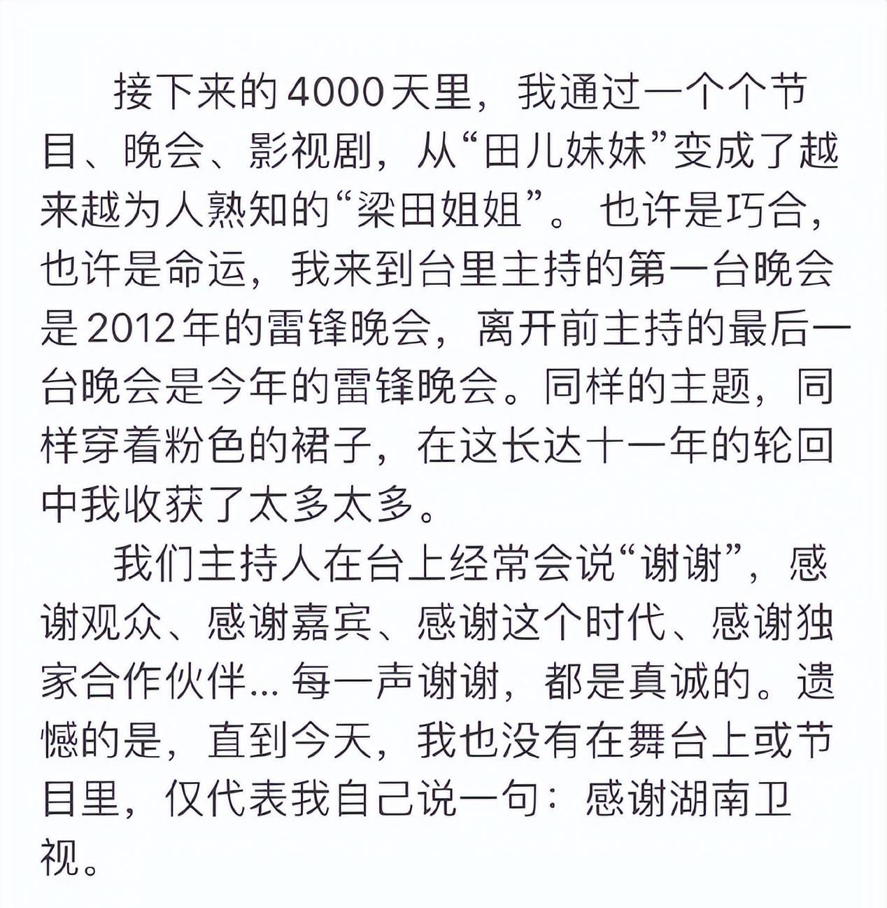 在接下来的4000天里,梁田通过一个个节目让更多的人熟识,也从“田儿妹妹”变成“梁田姐姐”,巧合的是,她来台里主持的第一台晚会是2012年的雷锋晚会,而离开前主持的最后一台晚会也是今年的雷锋晚会,同样的主持,11年的轮回里收获了太多太多,梁田也真诚地感谢湖南卫视。